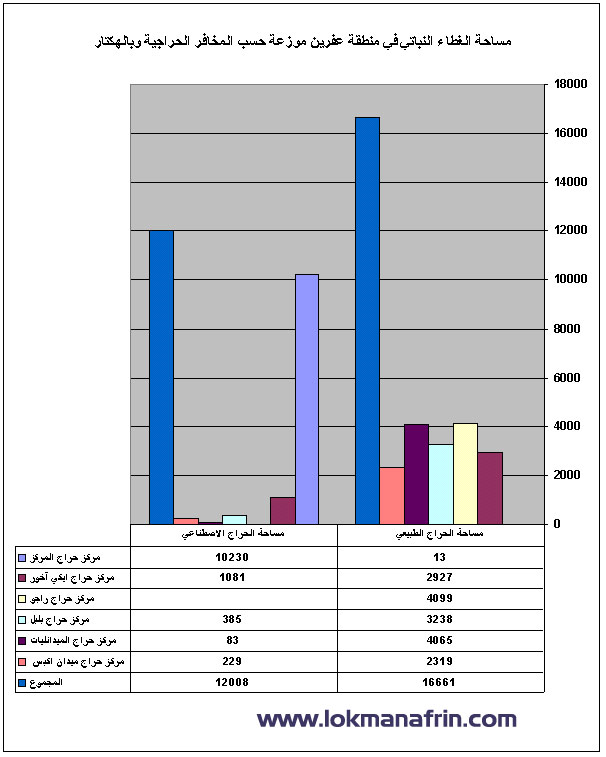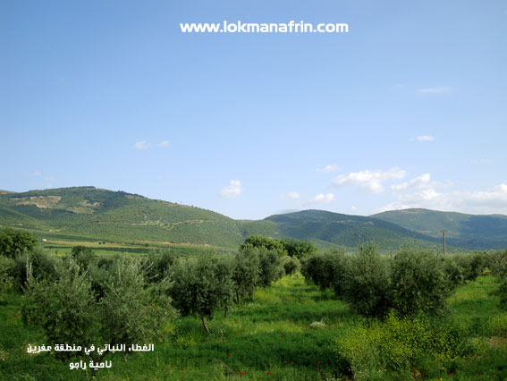 وقد قامت الدولة بتشجير مساحات شاسعة تقدر ﺑ / 13 ألف هكتار / ومن المقرر أن يتم تشجير أكثر من / 150 هكتار / وكل ذلك يتم في محاولة لإعادة الغطاء النباتي على ما كان عليه وأهم أنواع الحراج الصناعي : البطم الأطلسي – الكينا – السماق – الروبينيا .وأهم مناطق انتشاره جبال خاستياه وحايشتياه وهواره وبلاليكو وذوي ﮔراه بشكل متفرق في جميع أنحاء كتلة منطقة عفرين . ويلاحظ أن السفوح الغربية أكثر غنىً وتنوعاً بالغابات من السفوح الشرقية بسبب مواجهتها للأمطار المتوسطية وأهم المواقع المشجرة : جبل الزيدية – الباسوطة – الكفير – كفرجنة – مشعلة – ميدانكي – علي بازانلي – حلوبي – كورتك – قطمه – جبل ليلون – ديكمه طاش وهذا ساهم في إعادة الوجه الأخضر الناصع للمنطقة كما ساهم أبناء المنطقة من خلال اهتمامهم بزراعة أشجار الزيتون في زيادة مساحة المناطق المشجرة حيث تبلغ عدد أشجار الزيتون في المنطقة أكثر من / 13 / مليون شجرة تشكل المورد الأساسي لمعاش وحياة أبناء المنطقة رغم الكثير من المصاعب وأهمها حاجة المنطقة إلى معامل تكرير وفلترة وتعبئة لزيت الزيتون تراعى فيه المواصفات العالمية وتجعله زيتاً مؤهلاً للتصدير .. علماً أن زيت عفرين يعتبر من أجود أنواع الزيوت في العالم لنكهته المتميزة ولما يحويه من أحماض نافعة وصحية تجعله ثروة هامة وذهباً أخضراً يمتد في المنطقة وفي قلوب أبنائها .... إدارة لقمان عفريـــن دراسات الأستاذ محمد جمال حسو إعداد و تصوير و تصميم : لقمان شمو كالو 2009/11/27