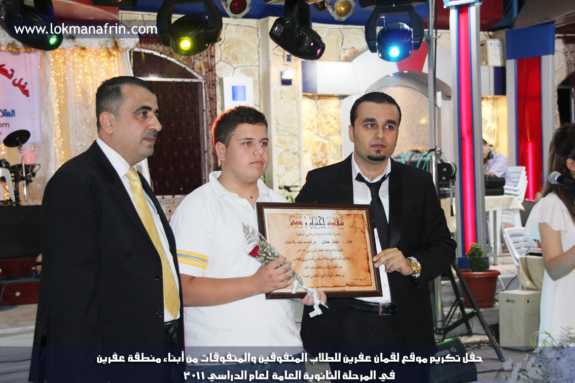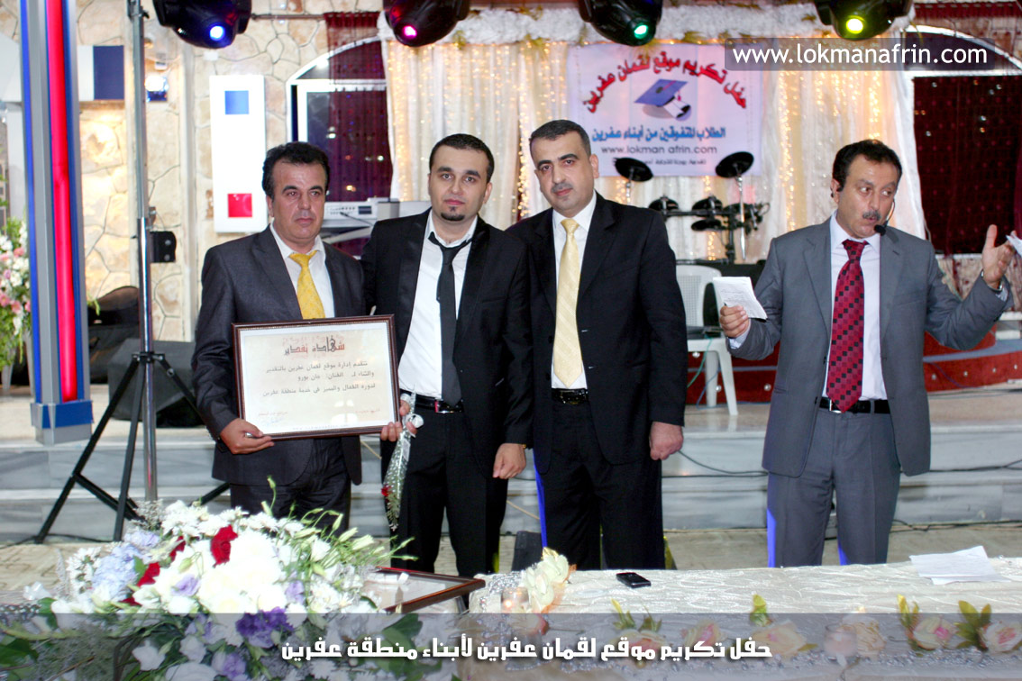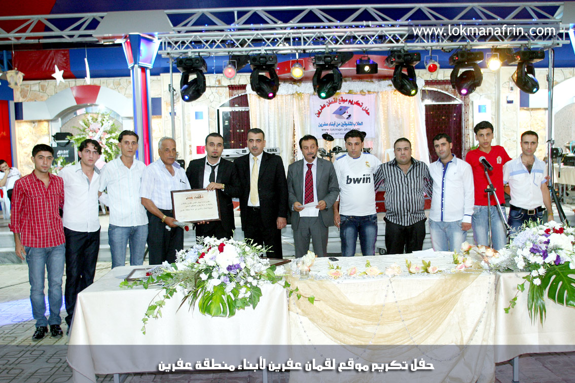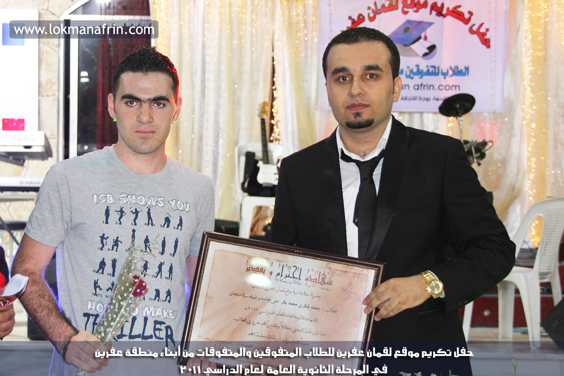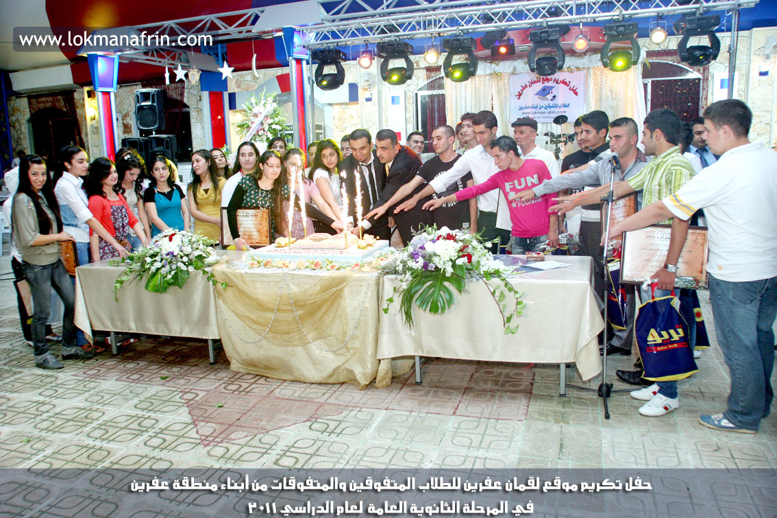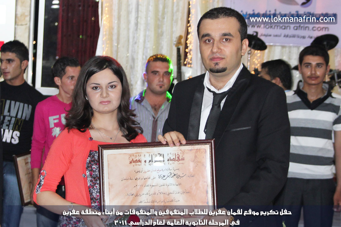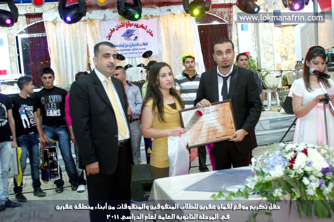 في أمسية الخامس من شهر آب 2011م ، شهدت صالة " جين عفرين للأفراح " تهافتاً جماهيرياً كبيراً فقد امتلأت الصالة بلفيف من أبناء عفرين ونواحيها وقراها ، فالحدث جللٌ ، في هذا اليوم أقامت إدارة " موقع لقمان عفرين " حفلاً تكريمياً للطلبة الأوائل من المتفوقين والمتفوقات في الثانوية العامة . بدأ الحفل في التاسعة مساءً حيث قام مقدما الحفل " بريشان " و" هيفان شيخو " بالحديث عن مناقب العلم والمعرفة ومن ثم تطرقا إلى لمحة موجزة عن " موقع لقمان عفرين " ، تلا ذلك كلمة ألقاها مدير الموقع المهندس : لقمان شمو كالو تحدث فيها عن دور العلم في تقدم المجتمعات ، شكر فيها المتفوقين على إبداعاتهم وشكر أهاليهم الذين سهروا الليالي في تأمين أجواء من الاستقرار لهم . تمنى مدير الموقع النجاح للحفل الذي يقيمه ووعد الحضور بمزيد من العطاء لسنوات قادمة .
