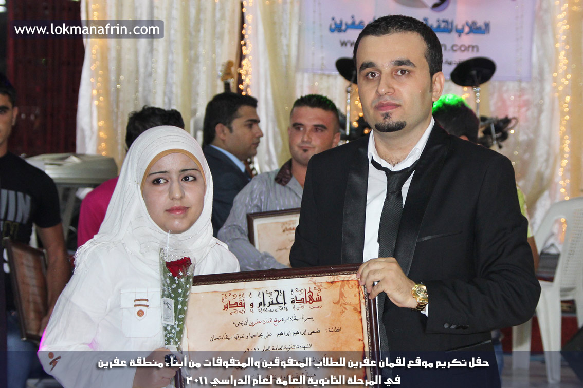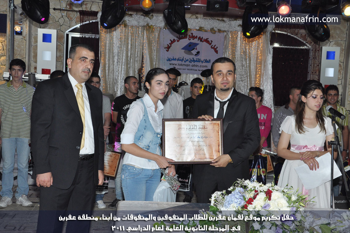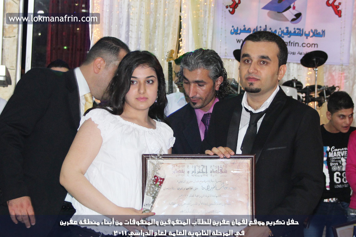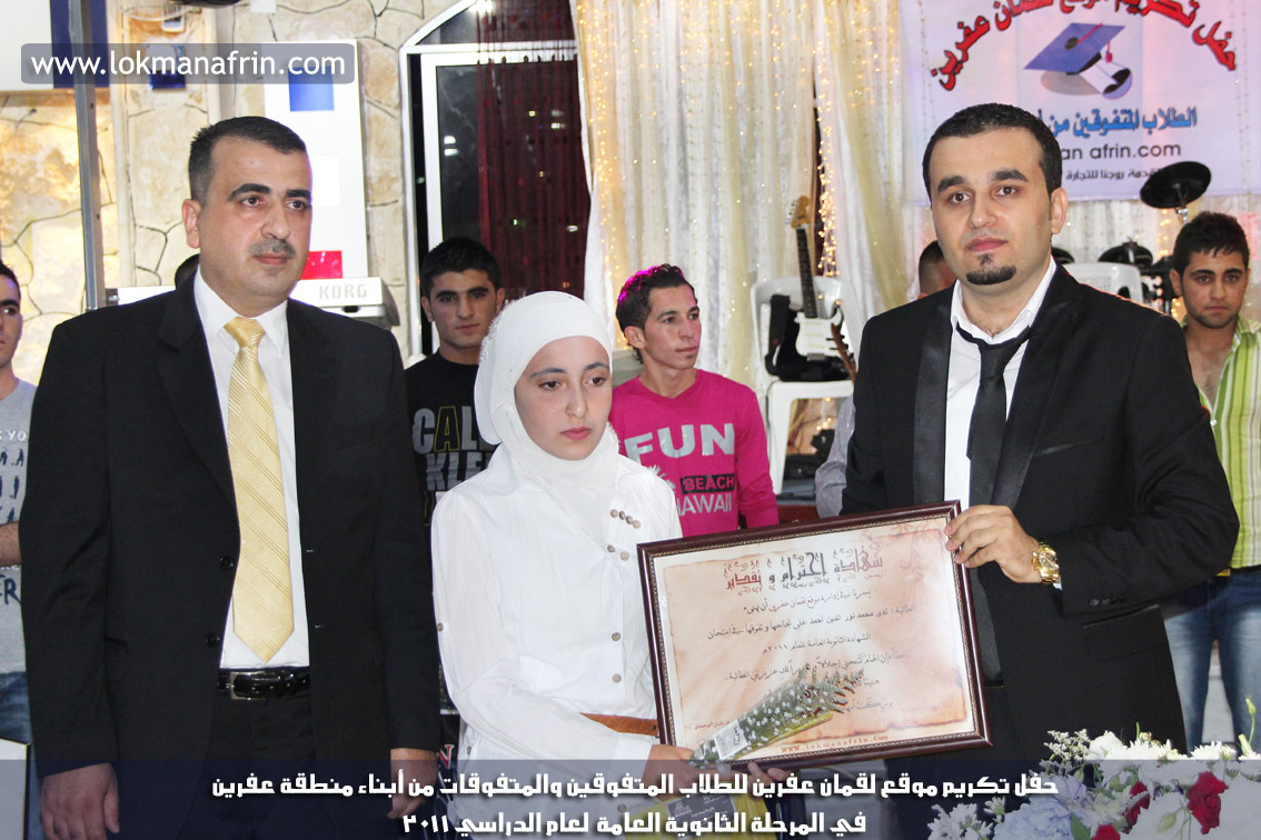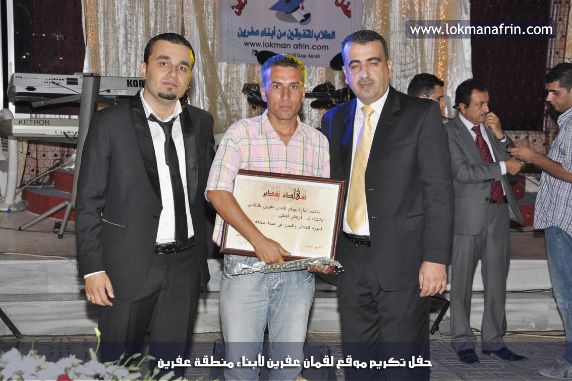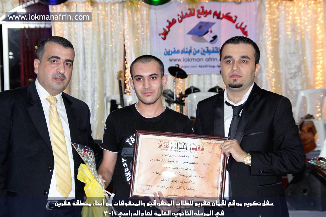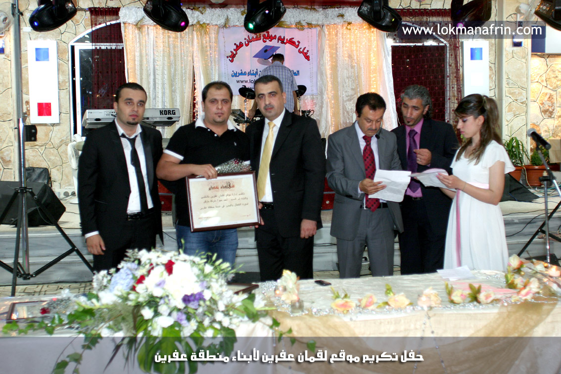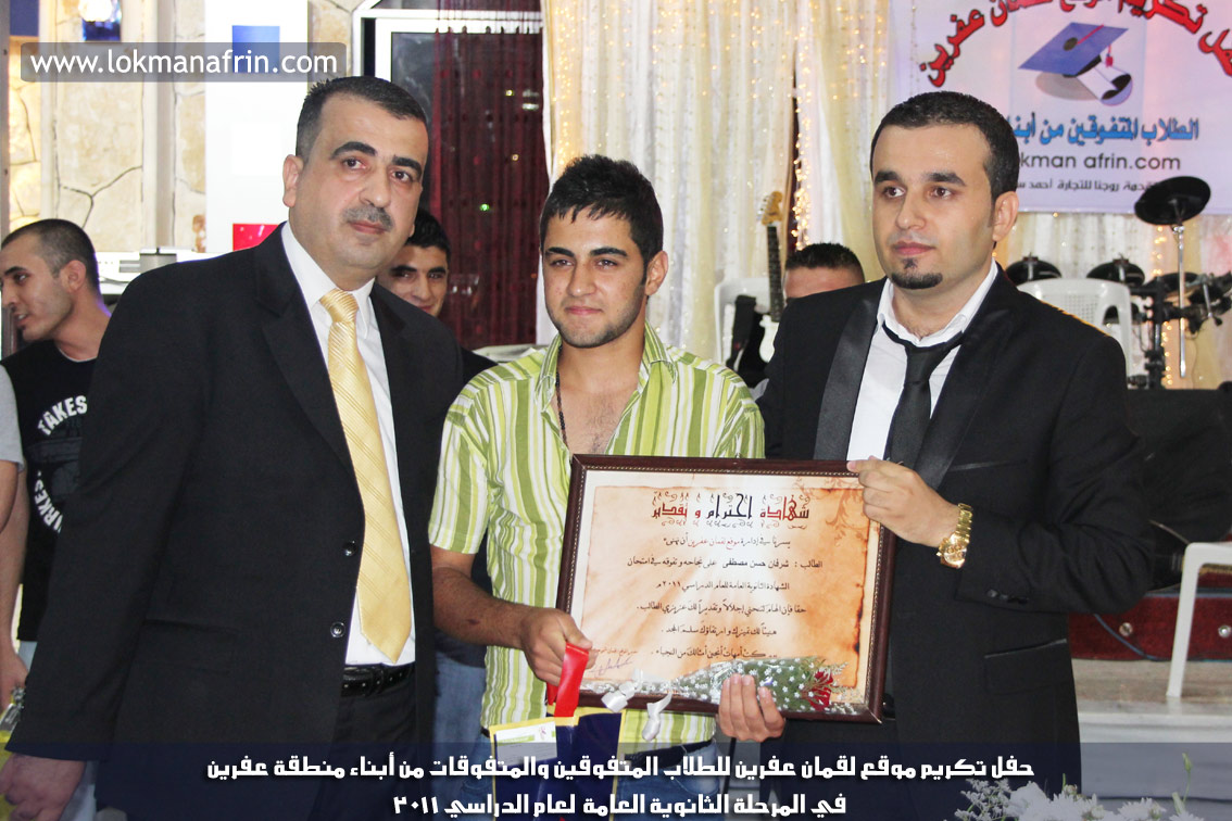 في أمسية الخامس من شهر آب 2011م ، شهدت صالة " جين عفرين للأفراح " تهافتاً جماهيرياً كبيراً فقد امتلأت الصالة بلفيف من أبناء عفرين ونواحيها وقراها ، فالحدث جللٌ ، في هذا اليوم أقامت إدارة " موقع لقمان عفرين " حفلاً تكريمياً للطلبة الأوائل من المتفوقين والمتفوقات في الثانوية العامة . بدأ الحفل في التاسعة مساءً حيث قام مقدما الحفل " بريشان " و" هيفان شيخو " بالحديث عن مناقب العلم والمعرفة ومن ثم تطرقا إلى لمحة موجزة عن " موقع لقمان عفرين " ، تلا ذلك كلمة ألقاها مدير الموقع المهندس : لقمان شمو كالو تحدث فيها عن دور العلم في تقدم المجتمعات ، شكر فيها المتفوقين على إبداعاتهم وشكر أهاليهم الذين سهروا الليالي في تأمين أجواء من الاستقرار لهم . تمنى مدير الموقع النجاح للحفل الذي يقيمه ووعد الحضور بمزيد من العطاء لسنوات قادمة .