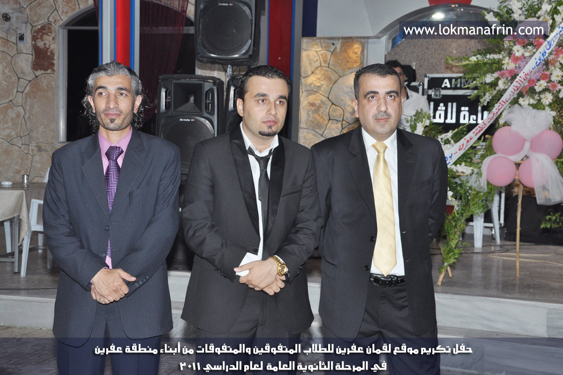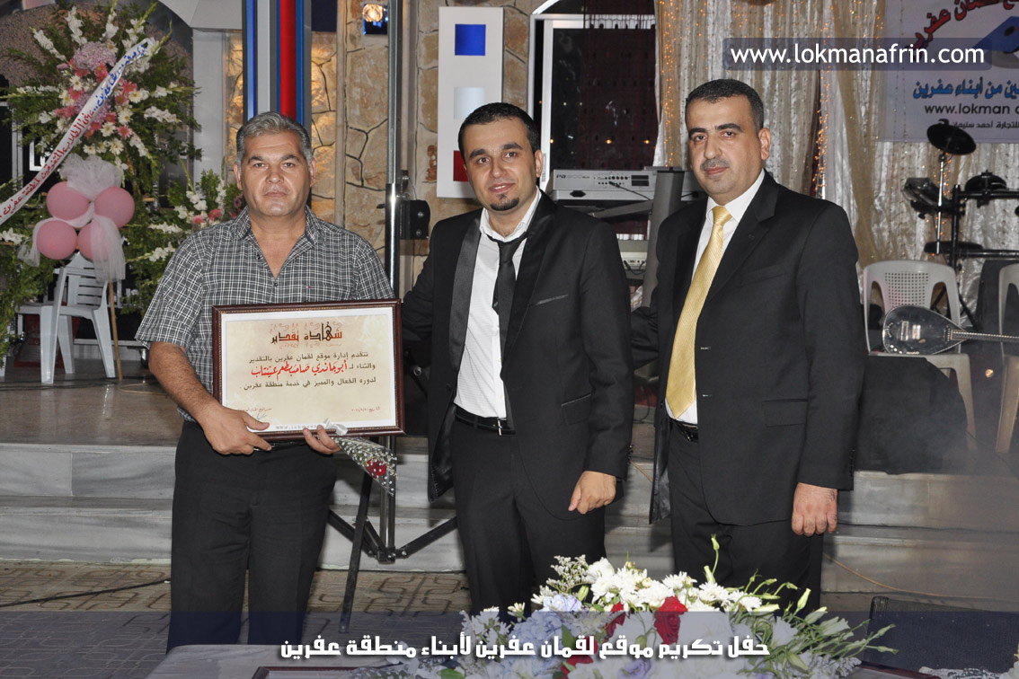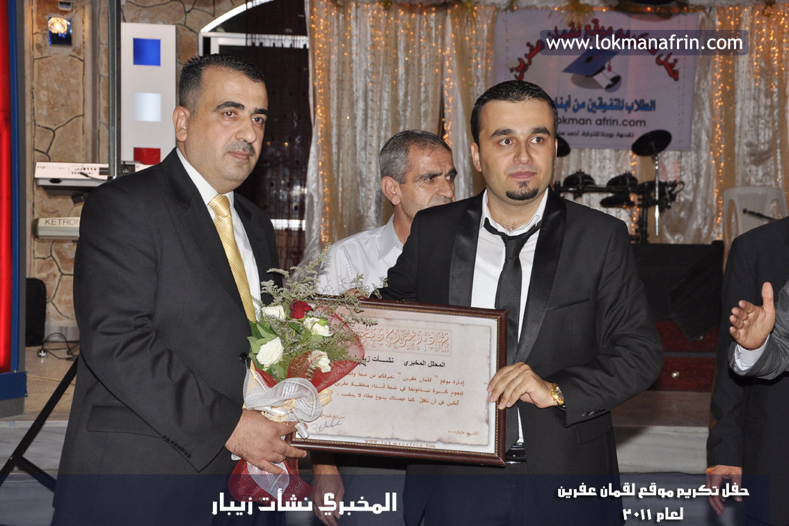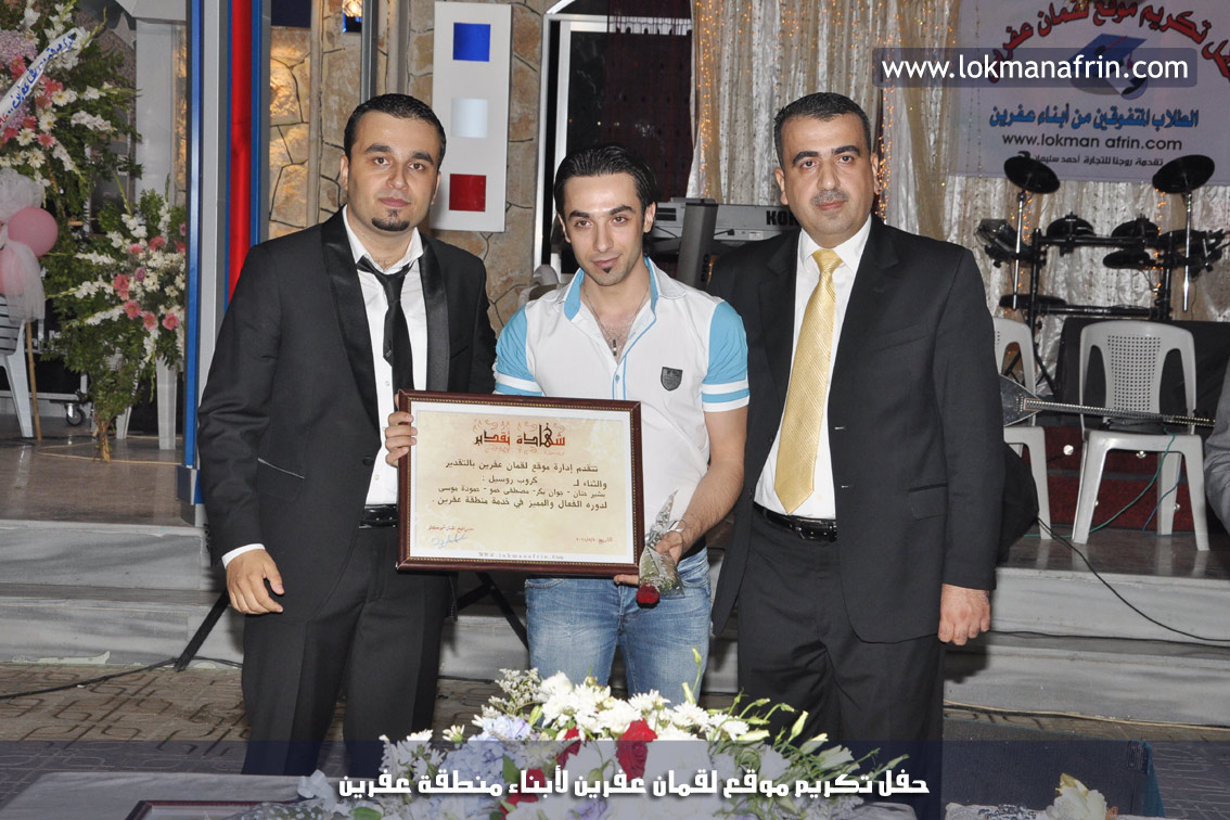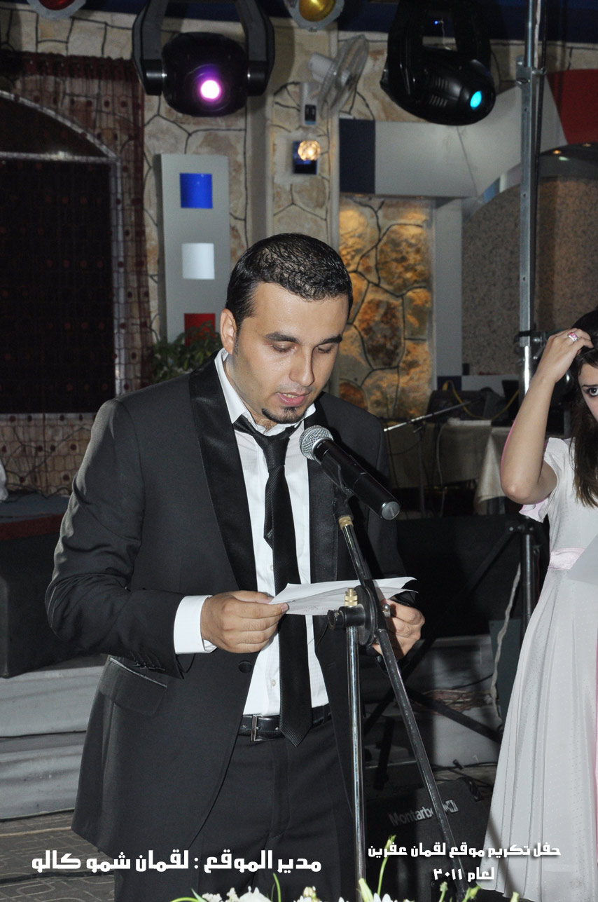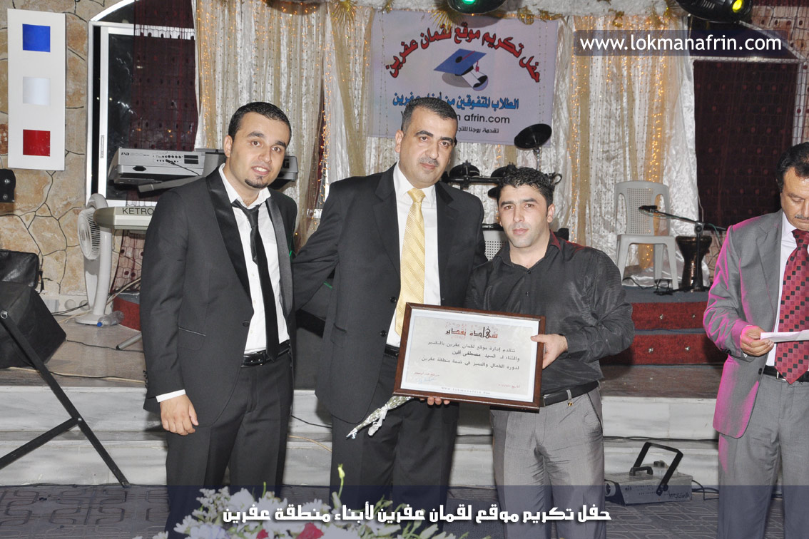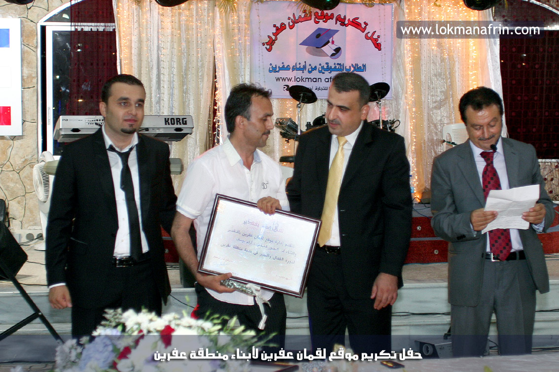 في أمسية الخامس من شهر آب 2011م ، شهدت صالة " جين عفرين للأفراح " تهافتاً جماهيرياً كبيراً فقد امتلأت الصالة بلفيف من أبناء عفرين ونواحيها وقراها ، فالحدث جللٌ ، في هذا اليوم أقامت إدارة " موقع لقمان عفرين " حفلاً تكريمياً للطلبة الأوائل من المتفوقين والمتفوقات في الثانوية العامة . بدأ الحفل في التاسعة مساءً حيث قام مقدما الحفل " بريشان " و" هيفان شيخو " بالحديث عن مناقب العلم والمعرفة ومن ثم تطرقا إلى لمحة موجزة عن " موقع لقمان عفرين " ، تلا ذلك كلمة ألقاها مدير الموقع المهندس : لقمان شمو كالو تحدث فيها عن دور العلم في تقدم المجتمعات ، شكر فيها المتفوقين على إبداعاتهم وشكر أهاليهم الذين سهروا الليالي في تأمين أجواء من الاستقرار لهم . تمنى مدير الموقع النجاح للحفل الذي يقيمه ووعد الحضور بمزيد من العطاء لسنوات قادمة .