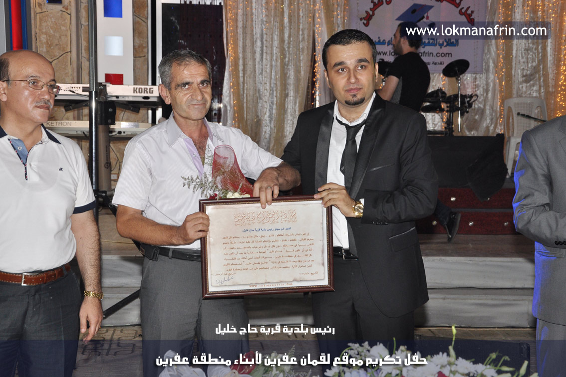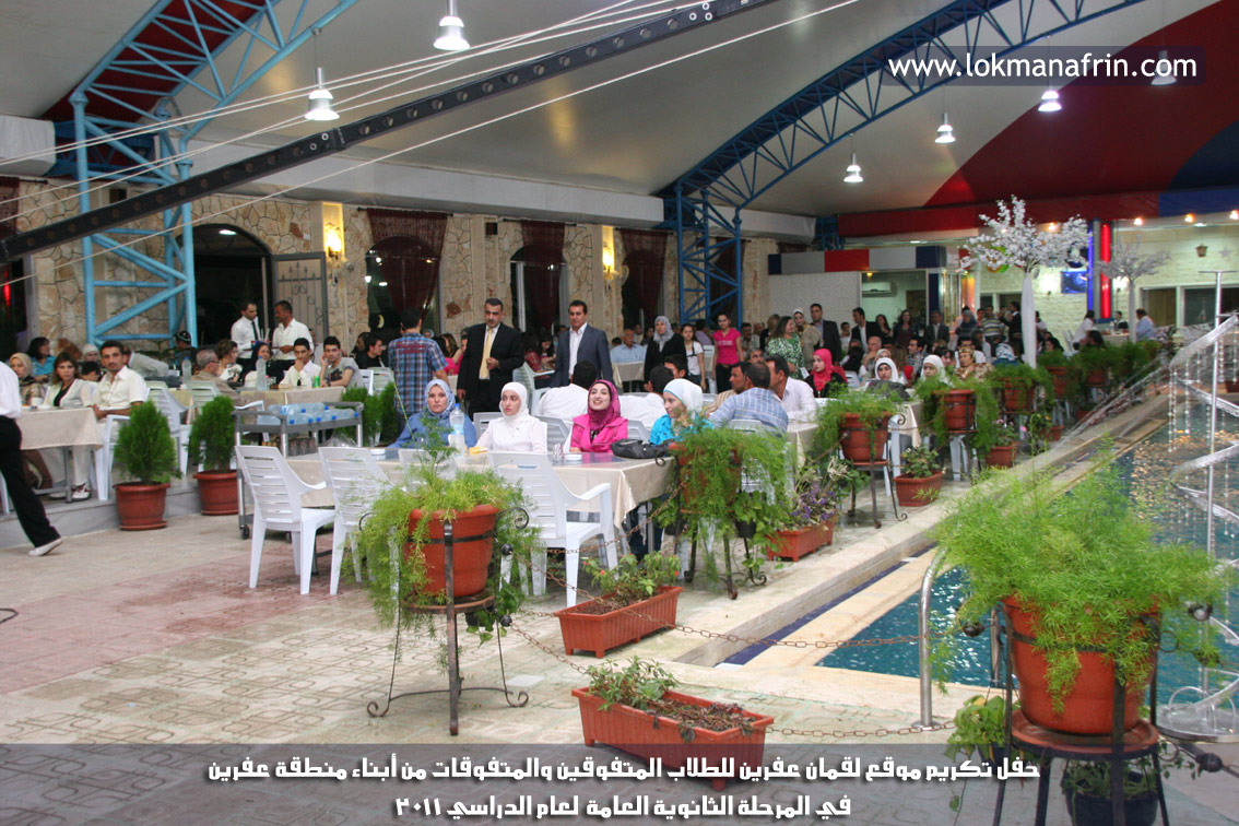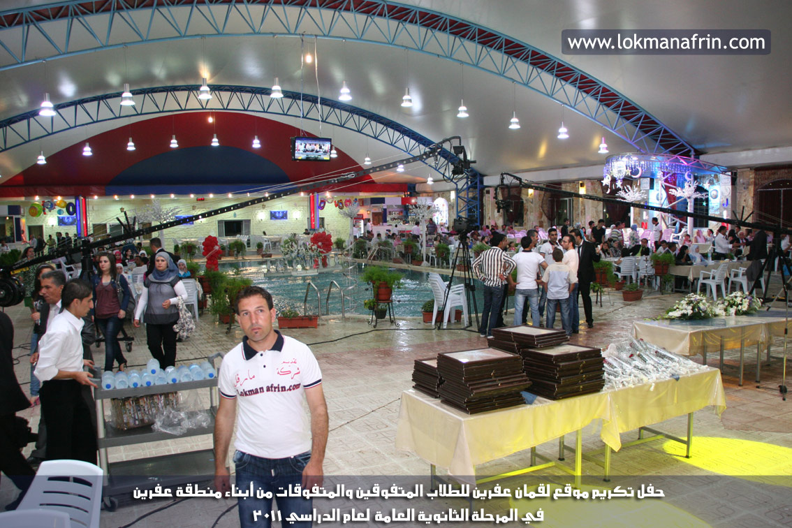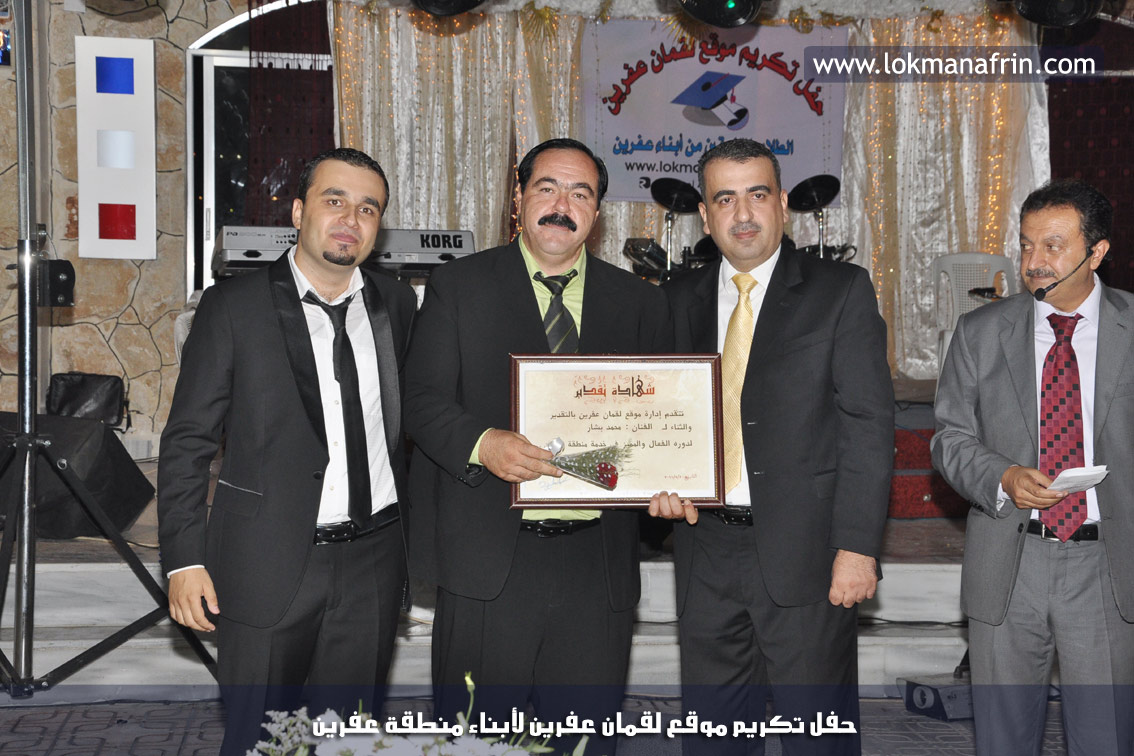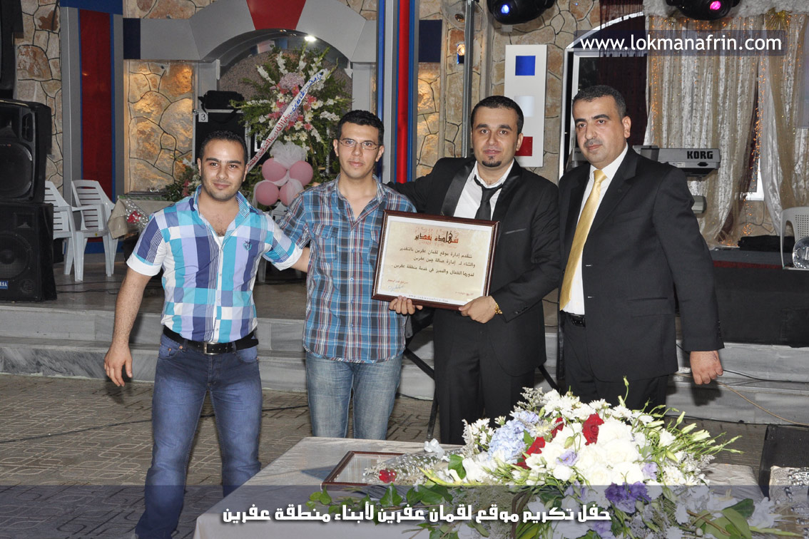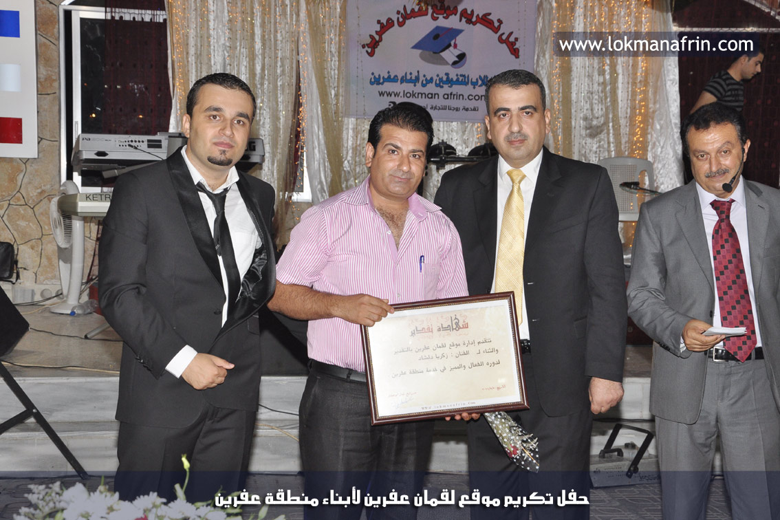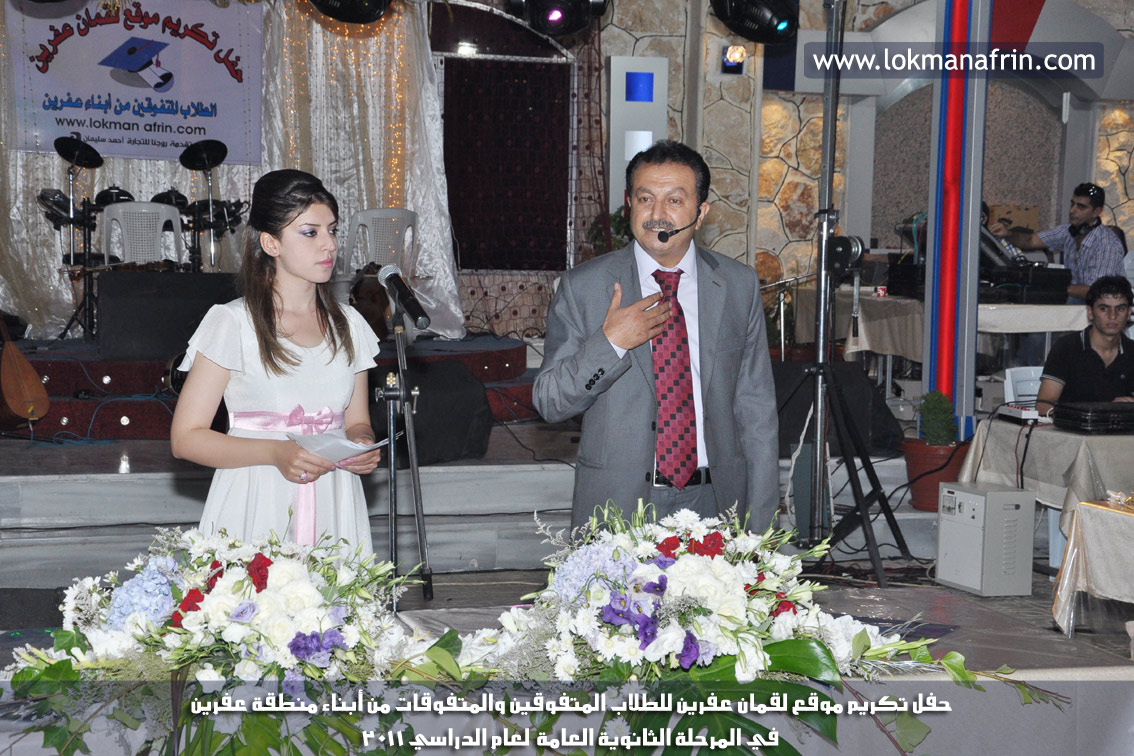 في أمسية الخامس من شهر آب 2011م ، شهدت صالة " جين عفرين للأفراح " تهافتاً جماهيرياً كبيراً فقد امتلأت الصالة بلفيف من أبناء عفرين ونواحيها وقراها ، فالحدث جللٌ ، في هذا اليوم أقامت إدارة " موقع لقمان عفرين " حفلاً تكريمياً للطلبة الأوائل من المتفوقين والمتفوقات في الثانوية العامة . بدأ الحفل في التاسعة مساءً حيث قام مقدما الحفل " بريشان " و" هيفان شيخو " بالحديث عن مناقب العلم والمعرفة ومن ثم تطرقا إلى لمحة موجزة عن " موقع لقمان عفرين " ، تلا ذلك كلمة ألقاها مدير الموقع المهندس : لقمان شمو كالو تحدث فيها عن دور العلم في تقدم المجتمعات ، شكر فيها المتفوقين على إبداعاتهم وشكر أهاليهم الذين سهروا الليالي في تأمين أجواء من الاستقرار لهم . تمنى مدير الموقع النجاح للحفل الذي يقيمه ووعد الحضور بمزيد من العطاء لسنوات قادمة .