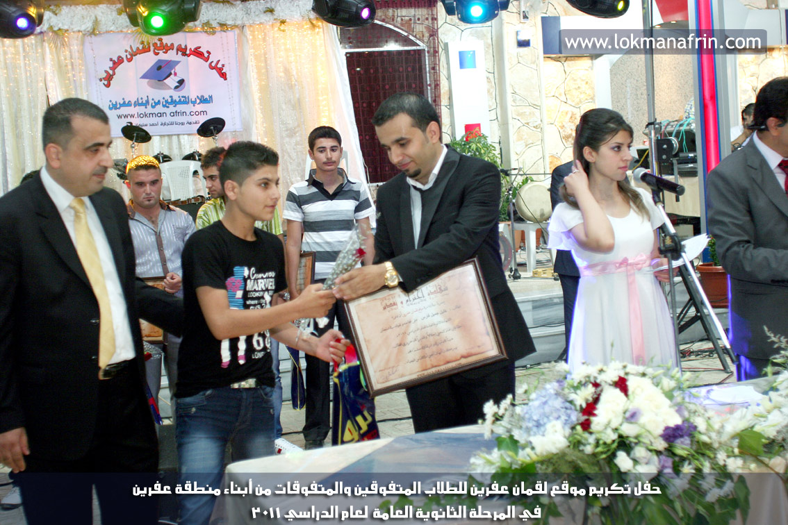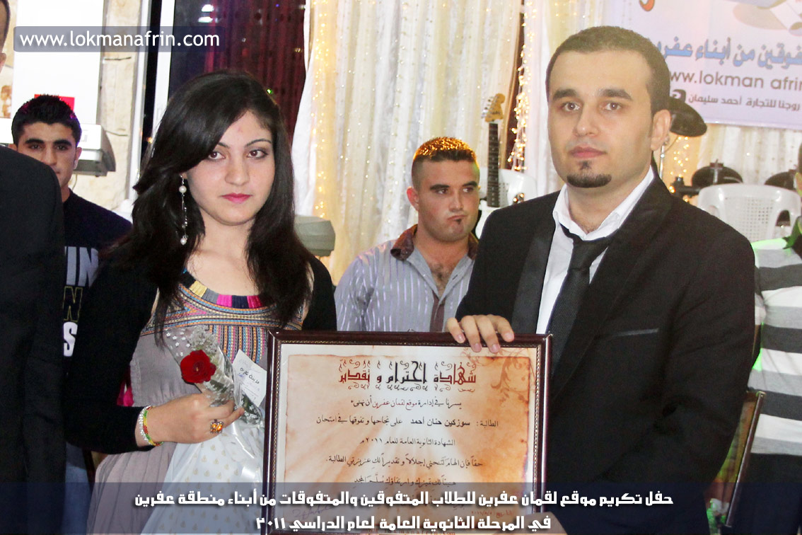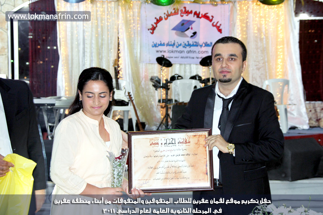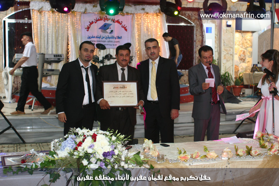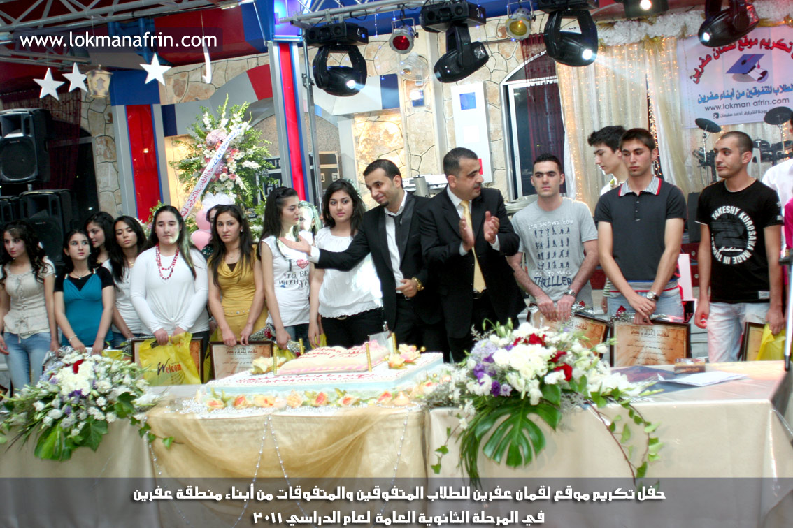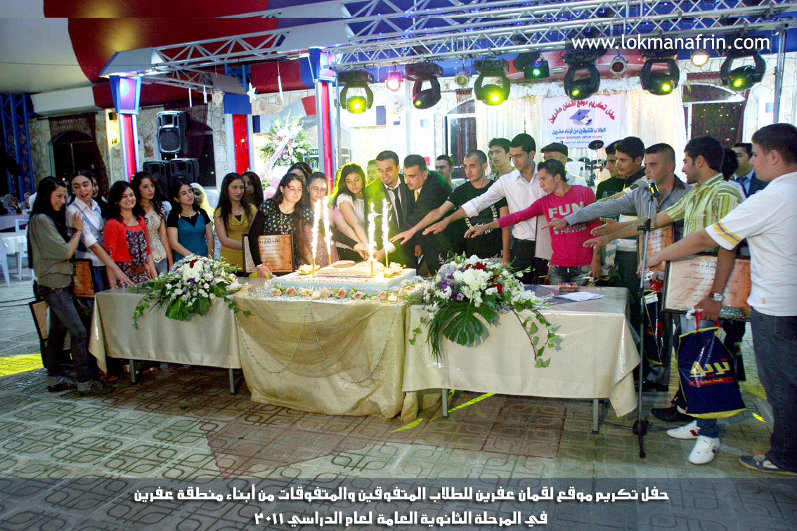 في أمسية الخامس من شهر آب 2011م ، شهدت صالة " جين عفرين للأفراح " تهافتاً جماهيرياً كبيراً فقد امتلأت الصالة بلفيف من أبناء عفرين ونواحيها وقراها ، فالحدث جللٌ ، في هذا اليوم أقامت إدارة " موقع لقمان عفرين " حفلاً تكريمياً للطلبة الأوائل من المتفوقين والمتفوقات في الثانوية العامة . بدأ الحفل في التاسعة مساءً حيث قام مقدما الحفل " بريشان " و" هيفان شيخو " بالحديث عن مناقب العلم والمعرفة ومن ثم تطرقا إلى لمحة موجزة عن " موقع لقمان عفرين " ، تلا ذلك كلمة ألقاها مدير الموقع المهندس : لقمان شمو كالو تحدث فيها عن دور العلم في تقدم المجتمعات ، شكر فيها المتفوقين على إبداعاتهم وشكر أهاليهم الذين سهروا الليالي في تأمين أجواء من الاستقرار لهم . تمنى مدير الموقع النجاح للحفل الذي يقيمه ووعد الحضور بمزيد من العطاء لسنوات قادمة .