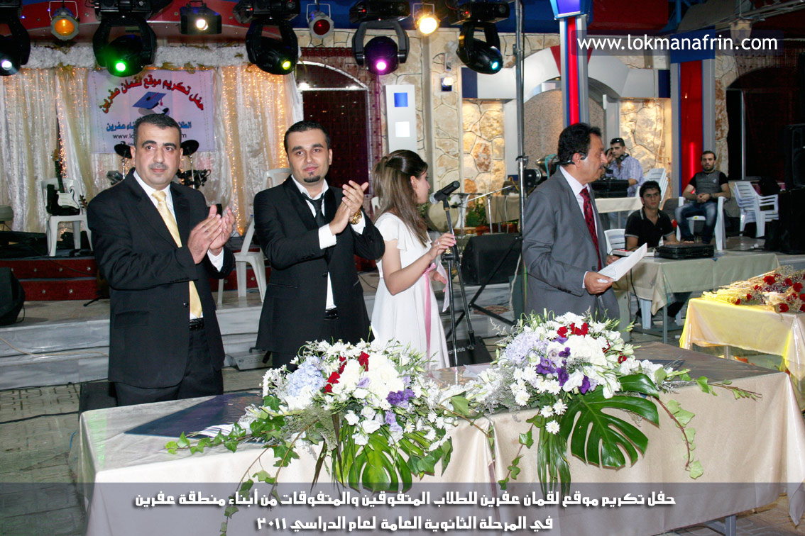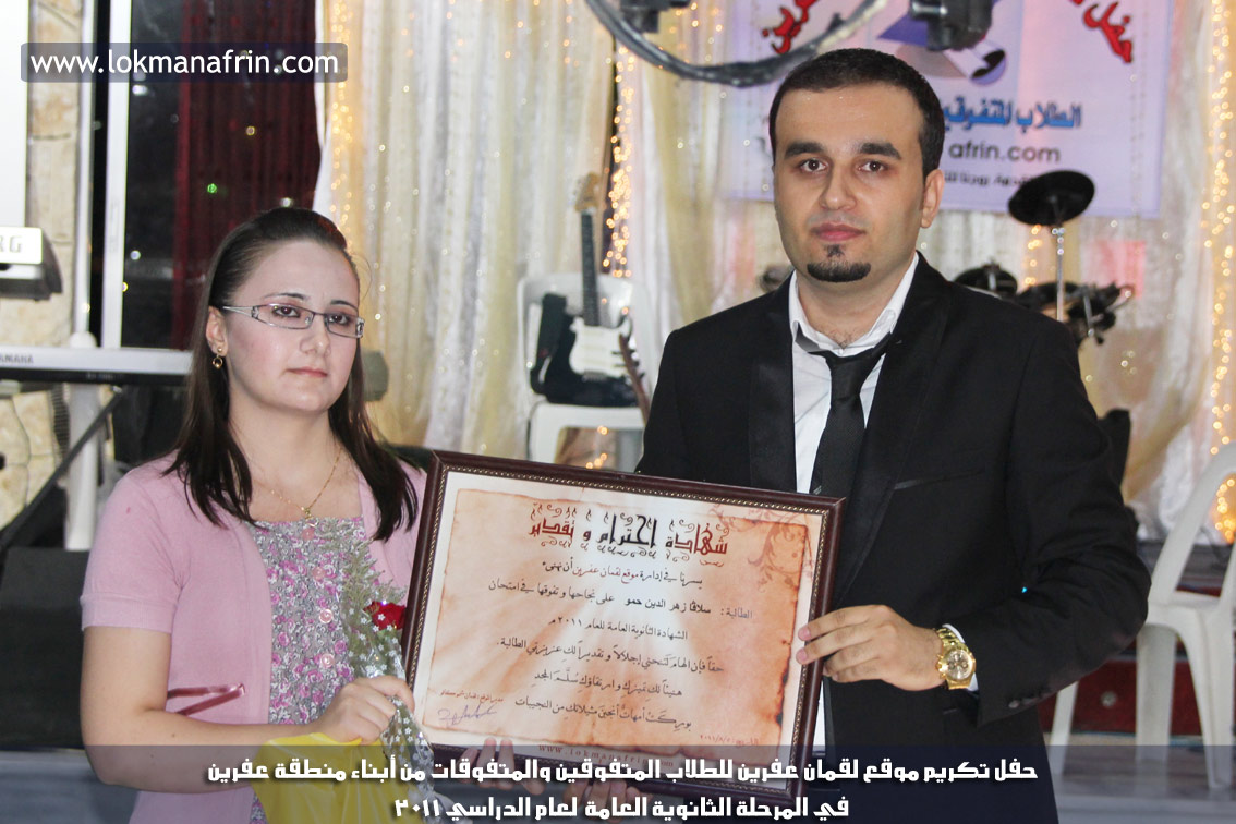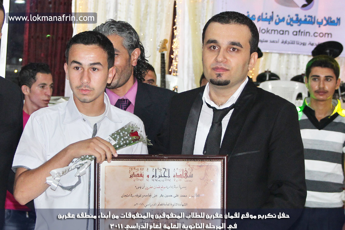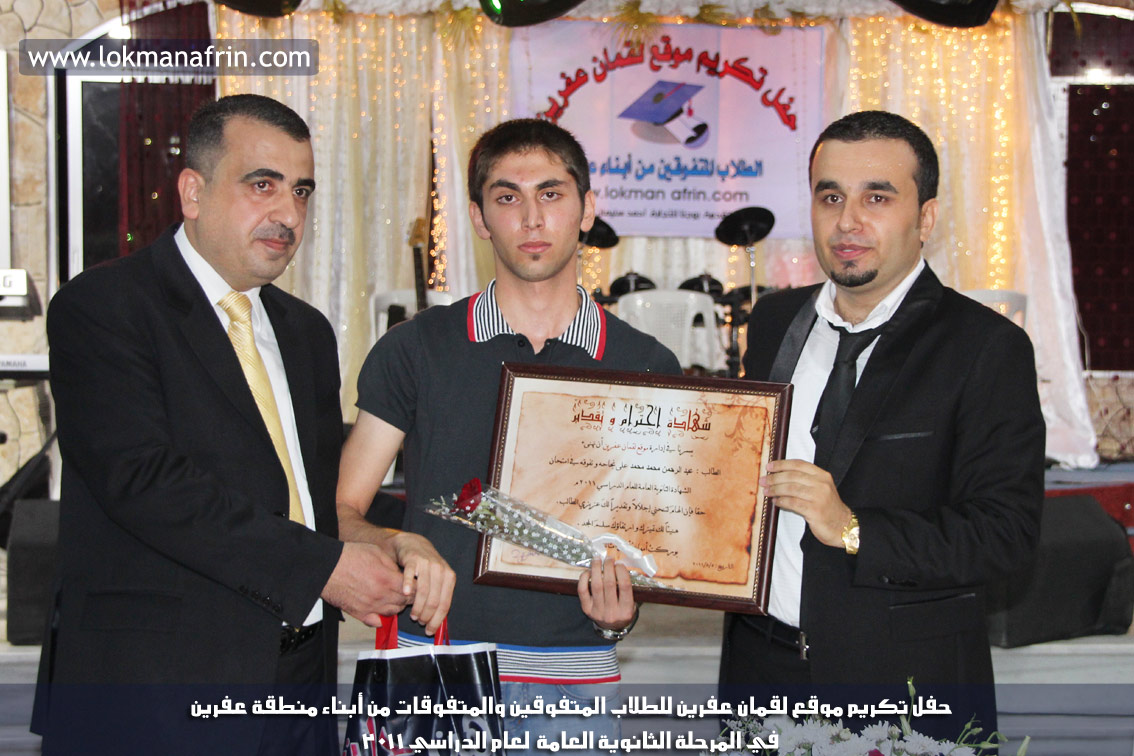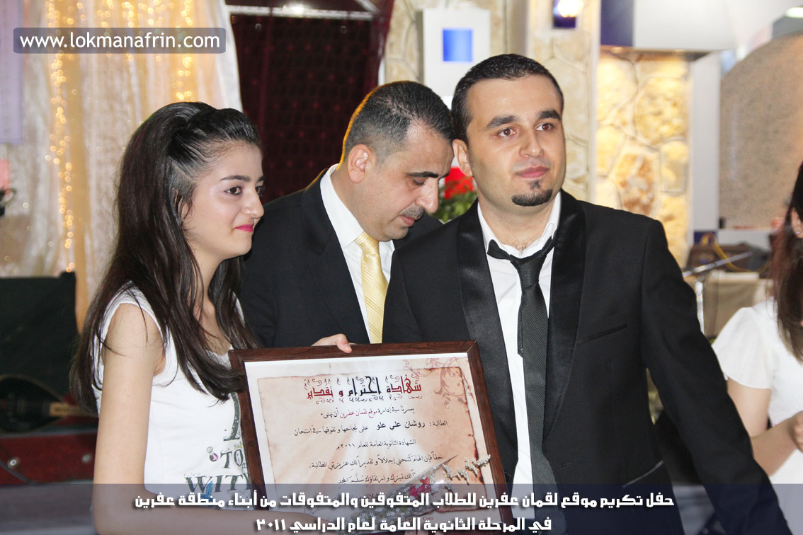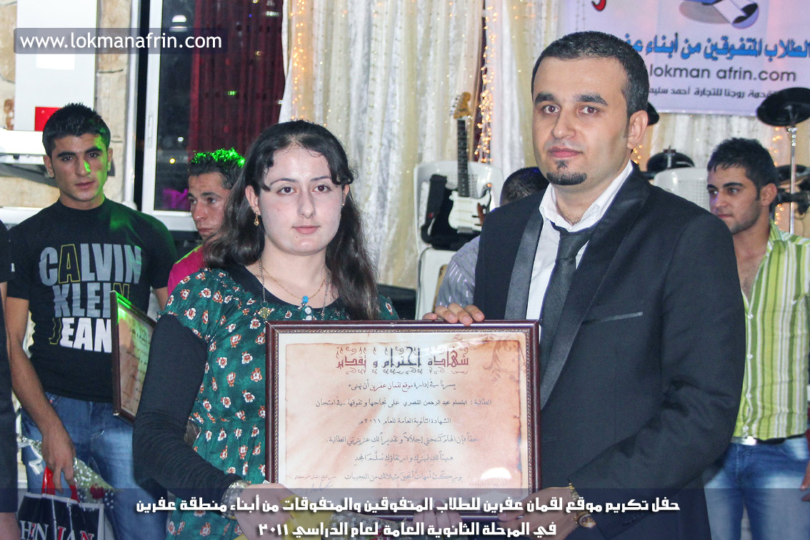 في أمسية الخامس من شهر آب 2011م ، شهدت صالة " جين عفرين للأفراح " تهافتاً جماهيرياً كبيراً فقد امتلأت الصالة بلفيف من أبناء عفرين ونواحيها وقراها ، فالحدث جللٌ ، في هذا اليوم أقامت إدارة " موقع لقمان عفرين " حفلاً تكريمياً للطلبة الأوائل من المتفوقين والمتفوقات في الثانوية العامة . بدأ الحفل في التاسعة مساءً حيث قام مقدما الحفل " بريشان " و" هيفان شيخو " بالحديث عن مناقب العلم والمعرفة ومن ثم تطرقا إلى لمحة موجزة عن " موقع لقمان عفرين " ، تلا ذلك كلمة ألقاها مدير الموقع المهندس : لقمان شمو كالو تحدث فيها عن دور العلم في تقدم المجتمعات ، شكر فيها المتفوقين على إبداعاتهم وشكر أهاليهم الذين سهروا الليالي في تأمين أجواء من الاستقرار لهم . تمنى مدير الموقع النجاح للحفل الذي يقيمه ووعد الحضور بمزيد من العطاء لسنوات قادمة .