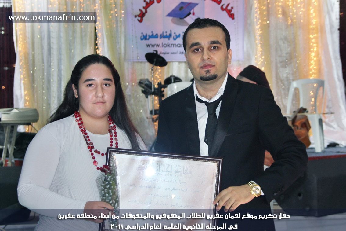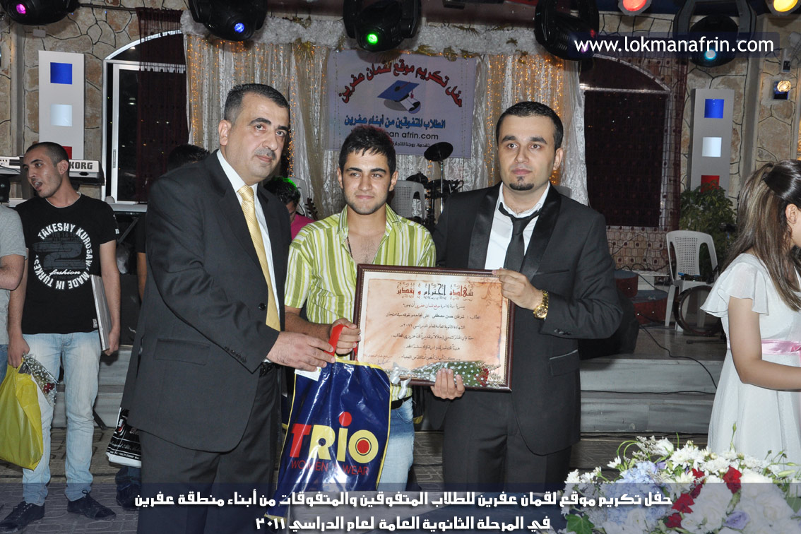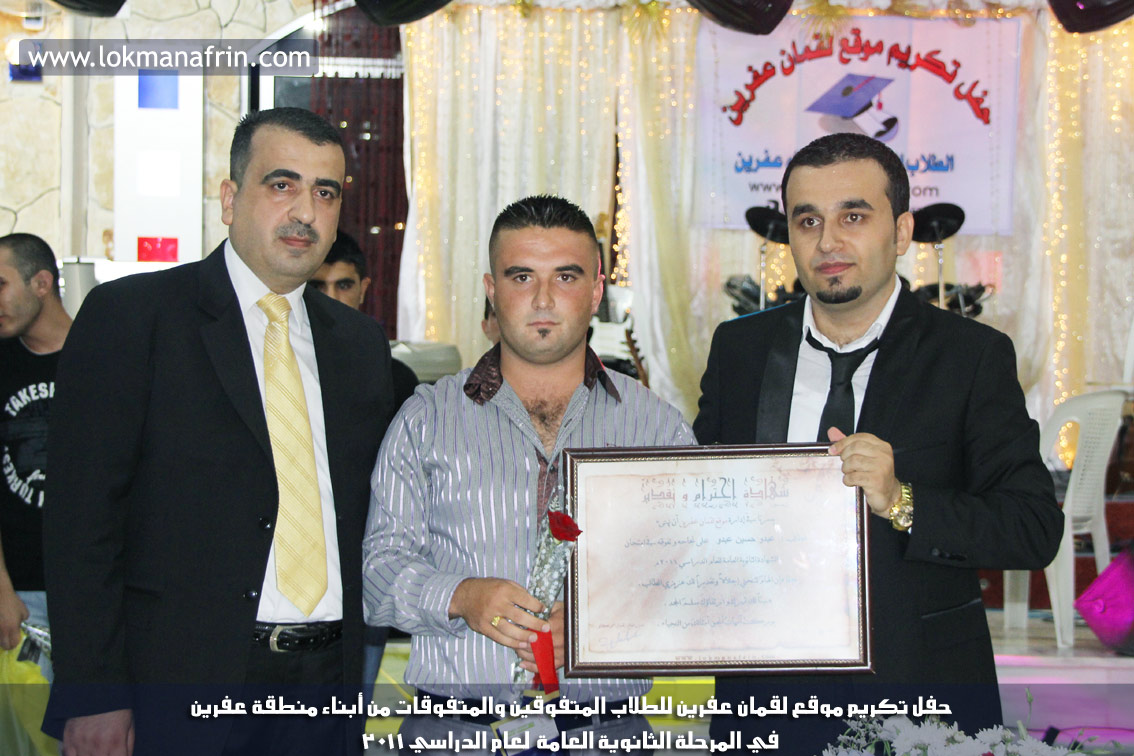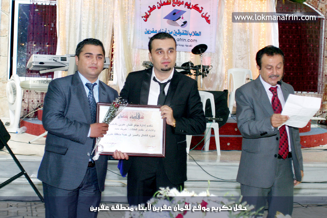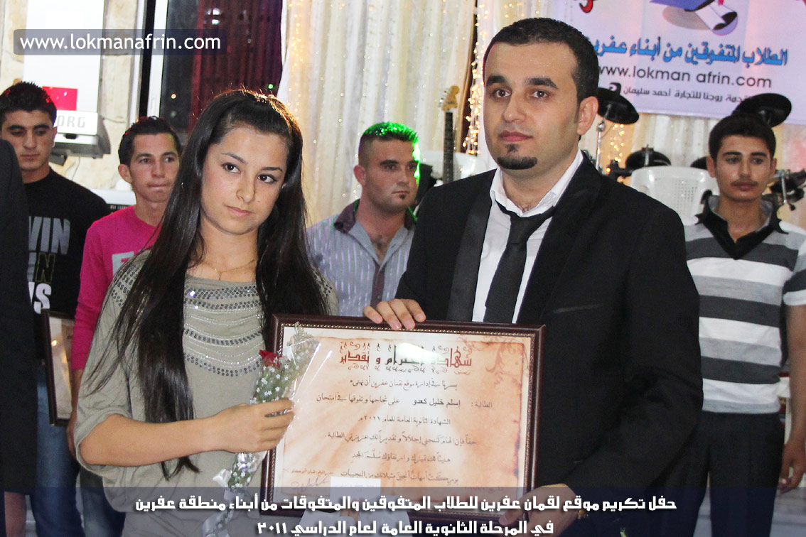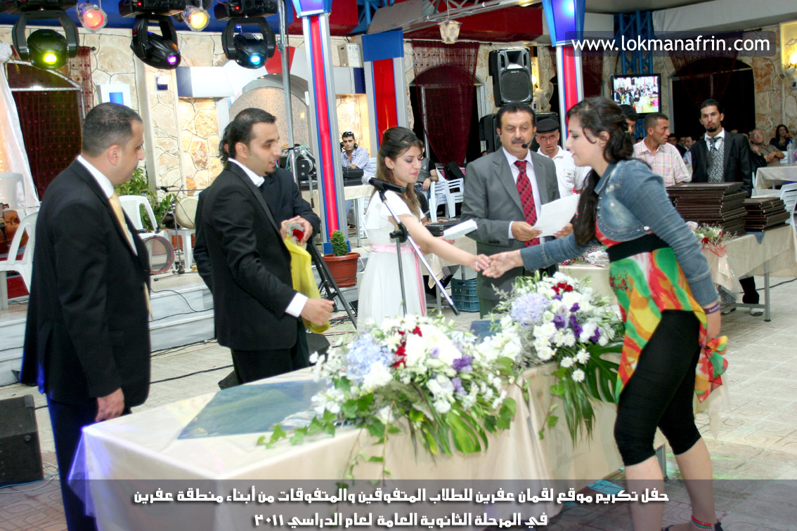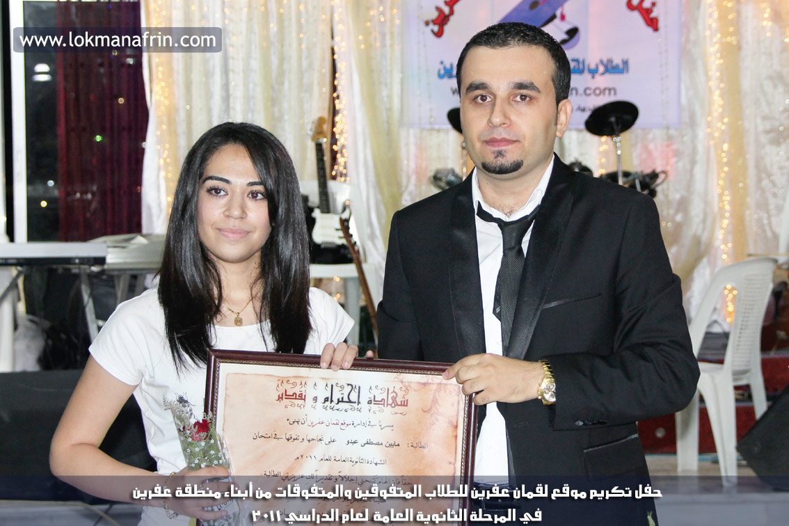في أمسية الخامس من شهر آب 2011م ، شهدت صالة " جين عفرين للأفراح " تهافتاً جماهيرياً كبيراً فقد امتلأت الصالة بلفيف من أبناء عفرين ونواحيها وقراها ، فالحدث جللٌ ، في هذا اليوم أقامت إدارة " موقع لقمان عفرين " حفلاً تكريمياً للطلبة الأوائل من المتفوقين والمتفوقات في الثانوية العامة . بدأ الحفل في التاسعة مساءً حيث قام مقدما الحفل " بريشان " و" هيفان شيخو " بالحديث عن مناقب العلم والمعرفة ومن ثم تطرقا إلى لمحة موجزة عن " موقع لقمان عفرين " ، تلا ذلك كلمة ألقاها مدير الموقع المهندس : لقمان شمو كالو تحدث فيها عن دور العلم في تقدم المجتمعات ، شكر فيها المتفوقين على إبداعاتهم وشكر أهاليهم الذين سهروا الليالي في تأمين أجواء من الاستقرار لهم . تمنى مدير الموقع النجاح للحفل الذي يقيمه ووعد الحضور بمزيد من العطاء لسنوات قادمة .