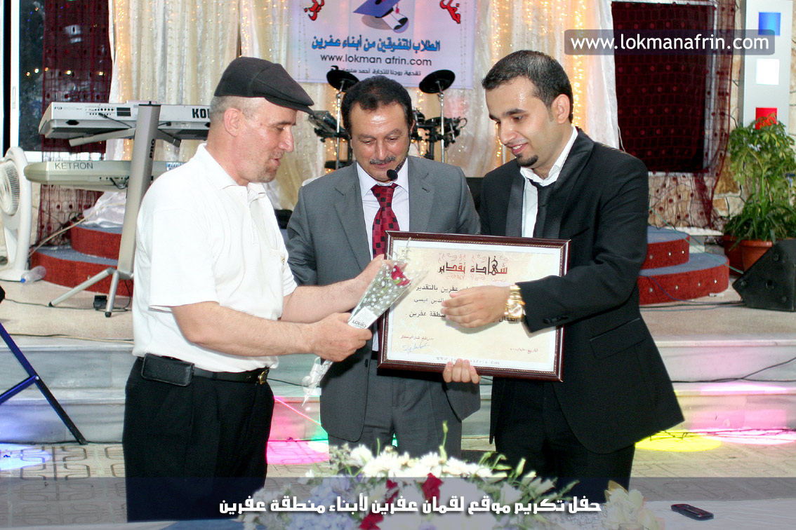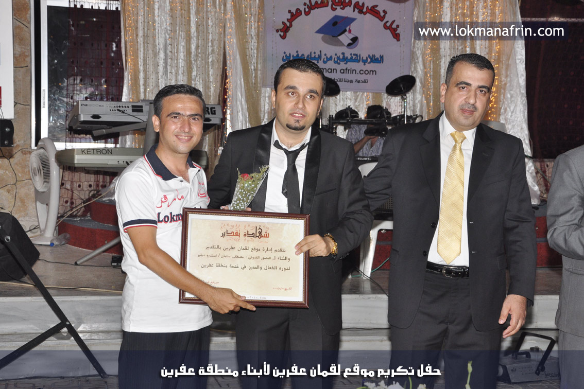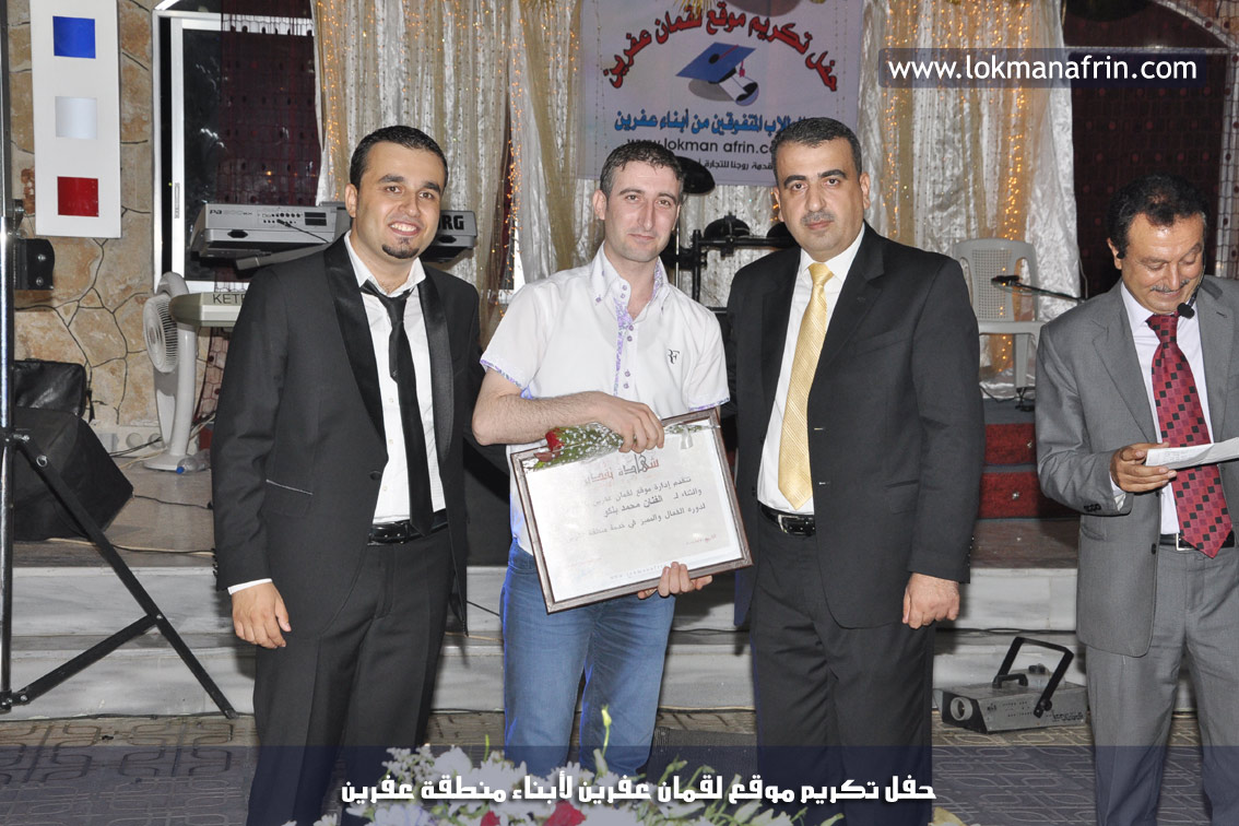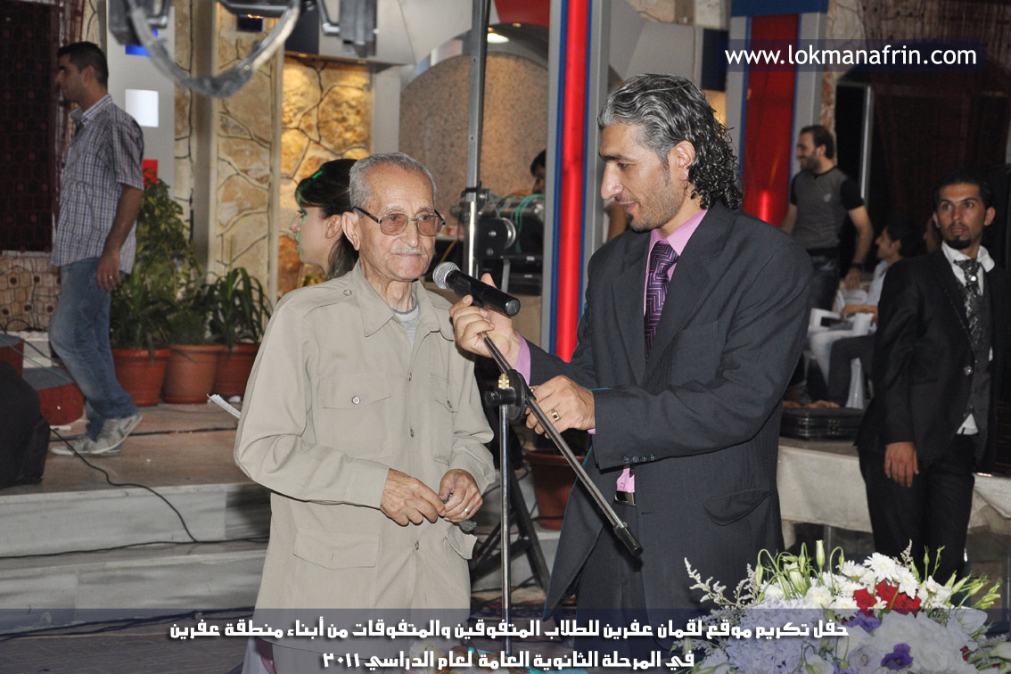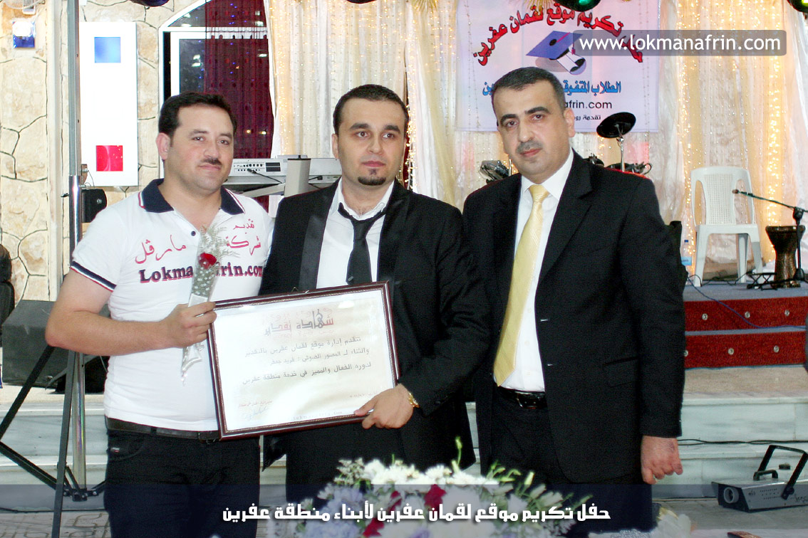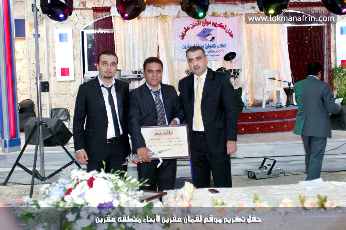 في أمسية الخامس من شهر آب 2011م ، شهدت صالة " جين عفرين للأفراح " تهافتاً جماهيرياً كبيراً فقد امتلأت الصالة بلفيف من أبناء عفرين ونواحيها وقراها ، فالحدث جللٌ ، في هذا اليوم أقامت إدارة " موقع لقمان عفرين " حفلاً تكريمياً للطلبة الأوائل من المتفوقين والمتفوقات في الثانوية العامة . بدأ الحفل في التاسعة مساءً حيث قام مقدما الحفل " بريشان " و" هيفان شيخو " بالحديث عن مناقب العلم والمعرفة ومن ثم تطرقا إلى لمحة موجزة عن " موقع لقمان عفرين " ، تلا ذلك كلمة ألقاها مدير الموقع المهندس : لقمان شمو كالو تحدث فيها عن دور العلم في تقدم المجتمعات ، شكر فيها المتفوقين على إبداعاتهم وشكر أهاليهم الذين سهروا الليالي في تأمين أجواء من الاستقرار لهم . تمنى مدير الموقع النجاح للحفل الذي يقيمه ووعد الحضور بمزيد من العطاء لسنوات قادمة .