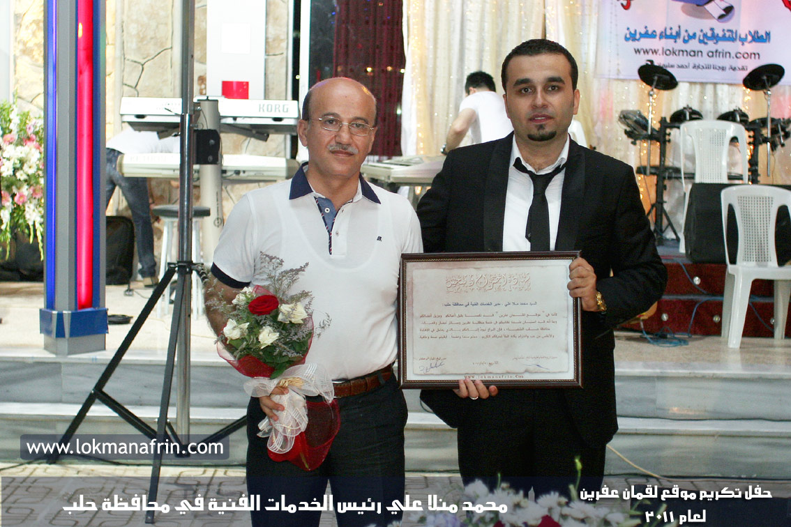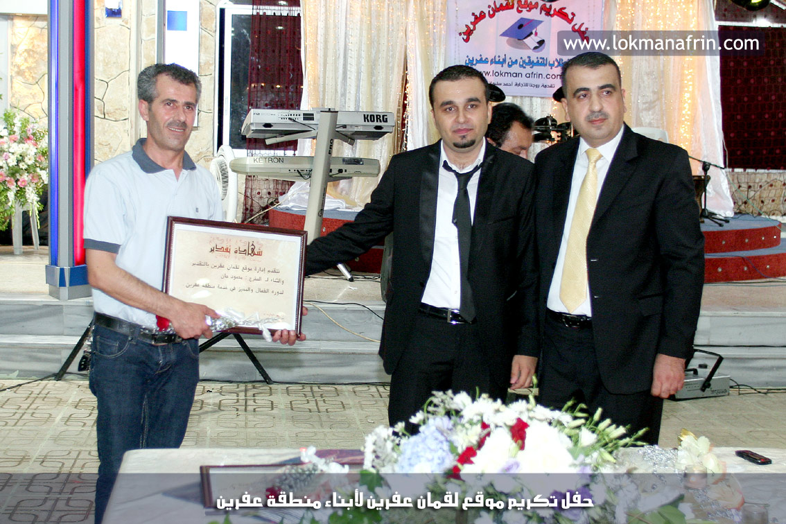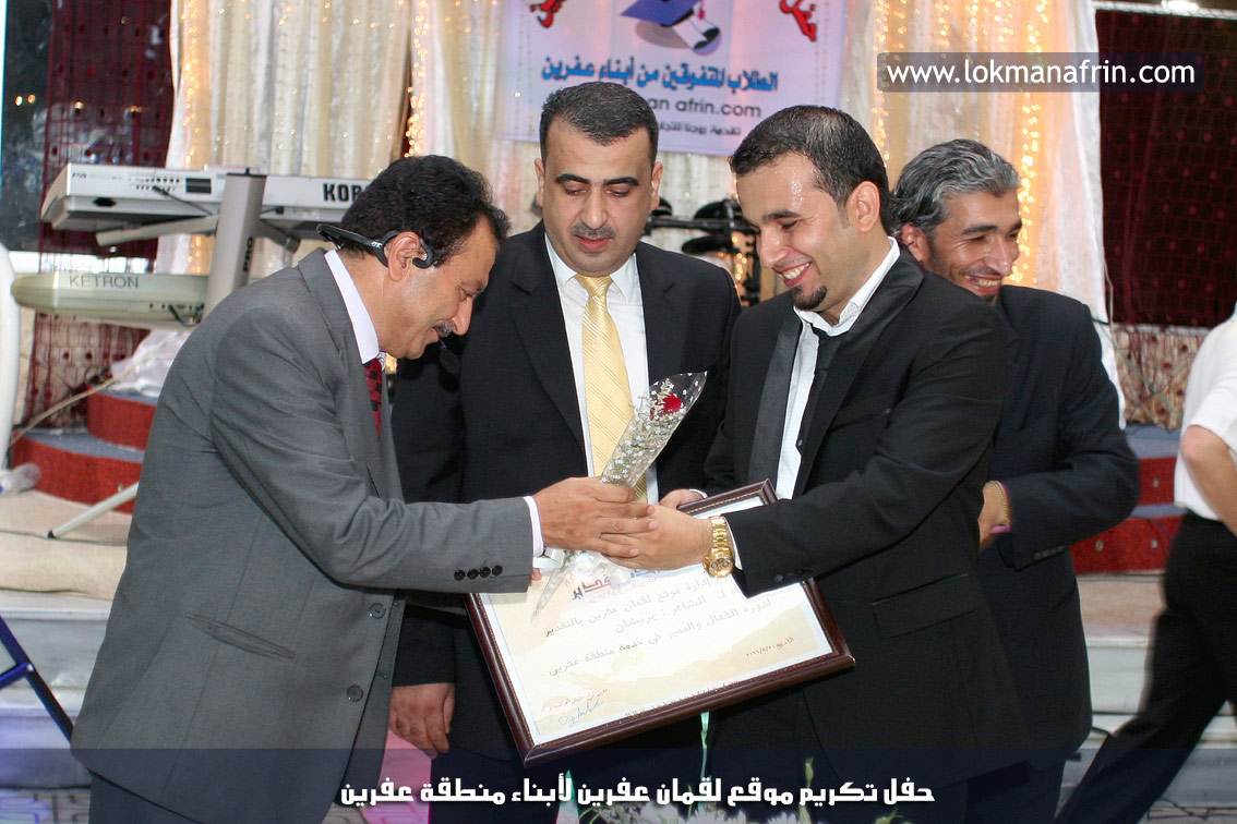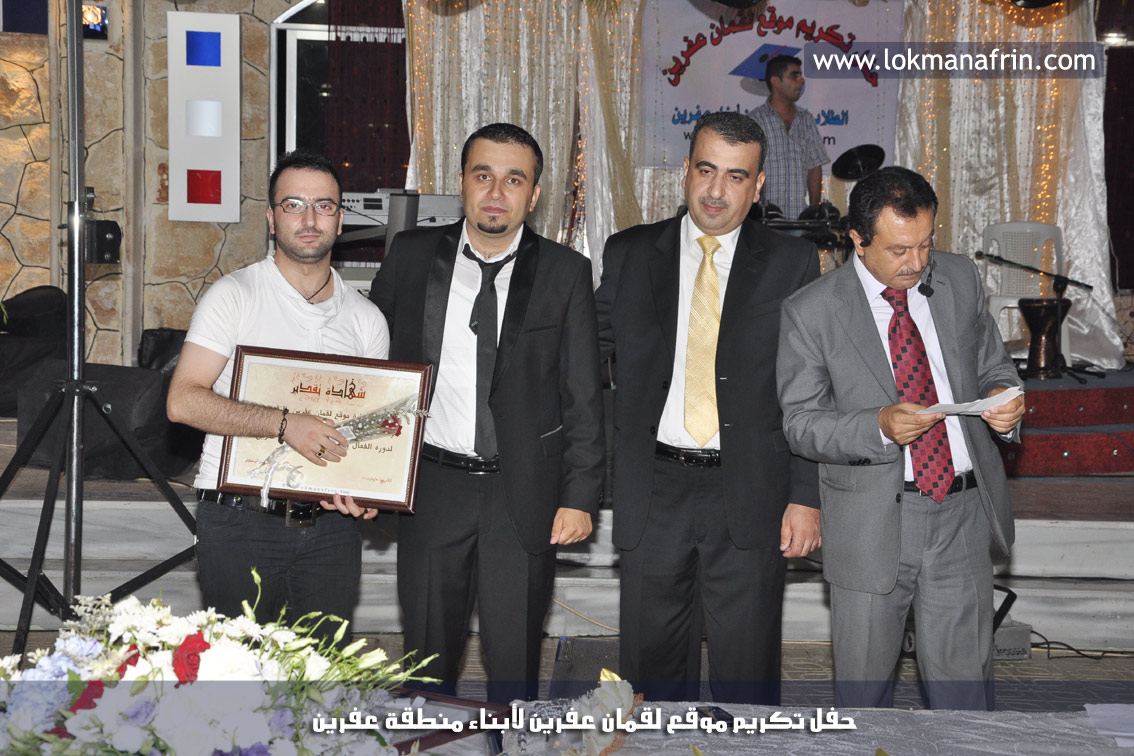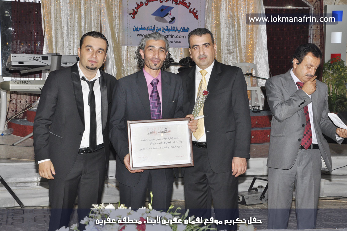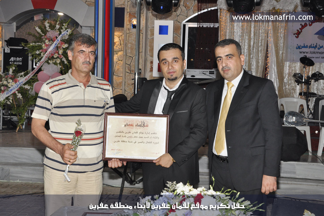 في أمسية الخامس من شهر آب 2011م ، شهدت صالة " جين عفرين للأفراح " تهافتاً جماهيرياً كبيراً فقد امتلأت الصالة بلفيف من أبناء عفرين ونواحيها وقراها ، فالحدث جللٌ ، في هذا اليوم أقامت إدارة " موقع لقمان عفرين " حفلاً تكريمياً للطلبة الأوائل من المتفوقين والمتفوقات في الثانوية العامة . بدأ الحفل في التاسعة مساءً حيث قام مقدما الحفل " بريشان " و" هيفان شيخو " بالحديث عن مناقب العلم والمعرفة ومن ثم تطرقا إلى لمحة موجزة عن " موقع لقمان عفرين " ، تلا ذلك كلمة ألقاها مدير الموقع المهندس : لقمان شمو كالو تحدث فيها عن دور العلم في تقدم المجتمعات ، شكر فيها المتفوقين على إبداعاتهم وشكر أهاليهم الذين سهروا الليالي في تأمين أجواء من الاستقرار لهم . تمنى مدير الموقع النجاح للحفل الذي يقيمه ووعد الحضور بمزيد من العطاء لسنوات قادمة .